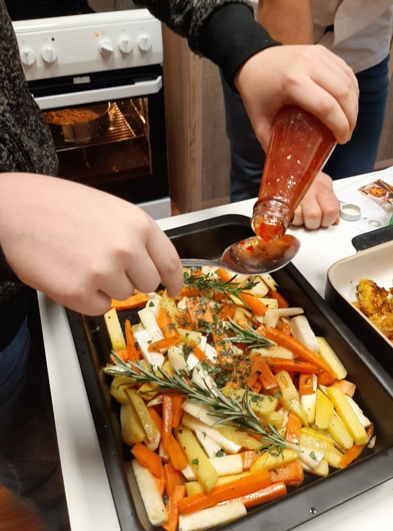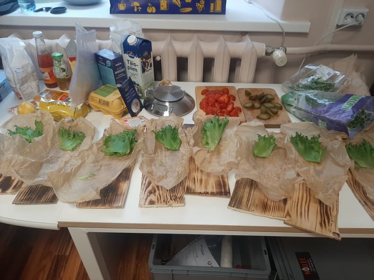 Esmalt vaatasime koos filmi toiduohutusest ja seejärel hakkasime kokkama. Toiduretseptid olid valitud Eesti toidu veebilehelt. Nendeks oli krõbedad kalapalad, röstitud köögiviljafriikad, kodujuustukaste ja magustoiduks purukook õuntega. Kõik liikusid kappide ja kraanikausi, pliidi vahel. Töö käis täies hoos.