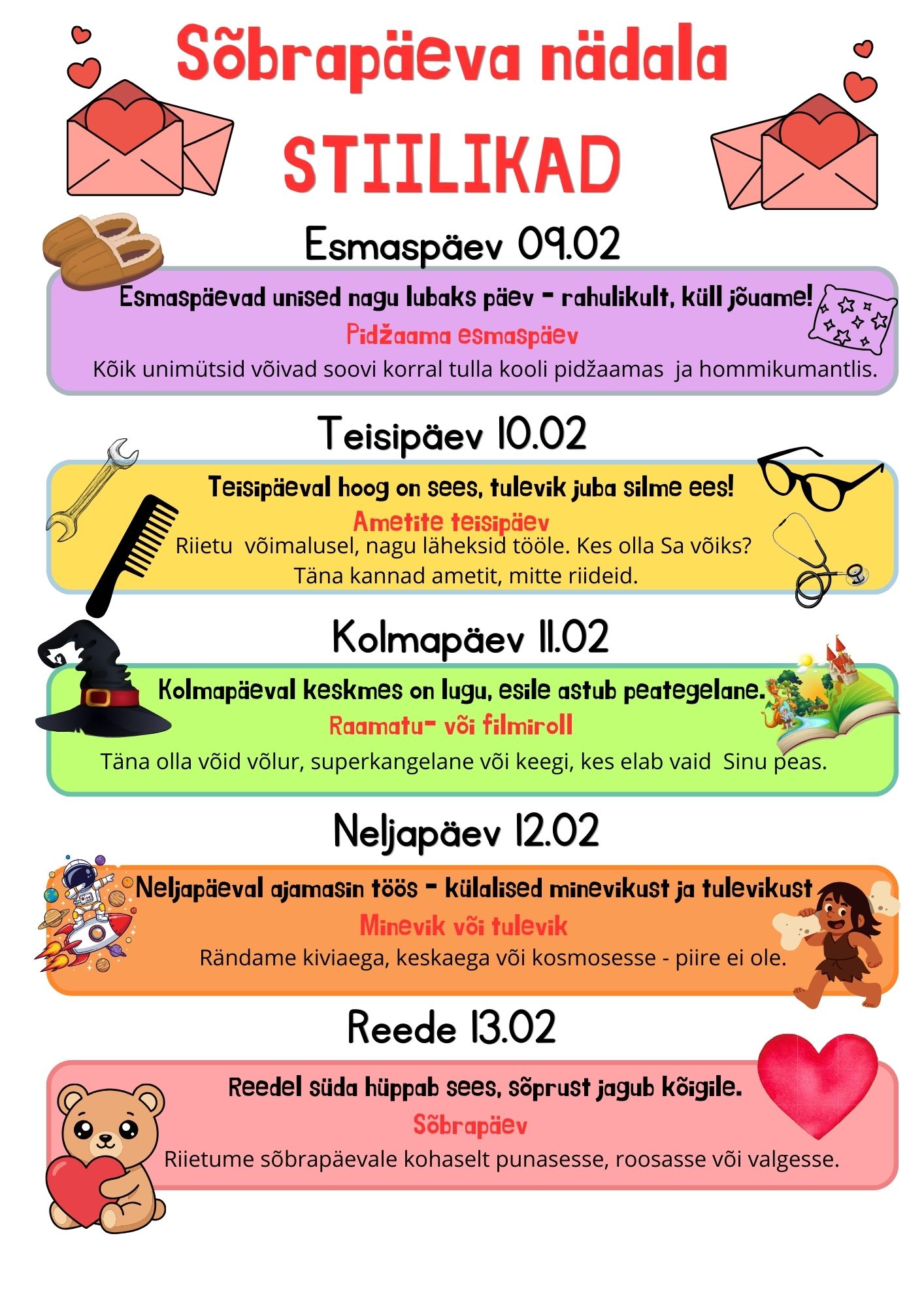 Sõbrapäeva nädalal (9.-13. veebruar) toimuvad koolis stiilipäevad! Täpsem info plakatil ja Stuudiumis.