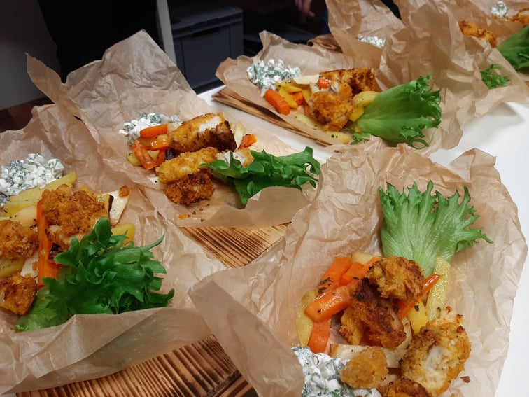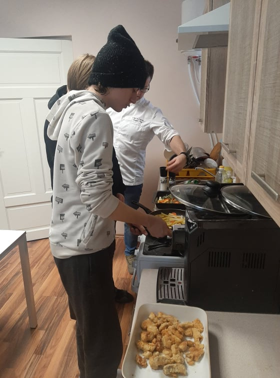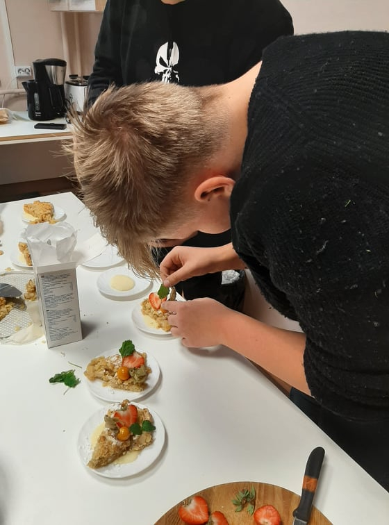 Esmalt vaatasime koos filmi toiduohutusest ja seejärel hakkasime kokkama. Toiduretseptid olid valitud Eesti toidu veebilehelt. Nendeks oli krõbedad kalapalad, röstitud köögiviljafriikad, kodujuustukaste ja magustoiduks purukook õuntega. Kõik liikusid kappide ja kraanikausi, pliidi vahel. Töö käis täies hoos.
