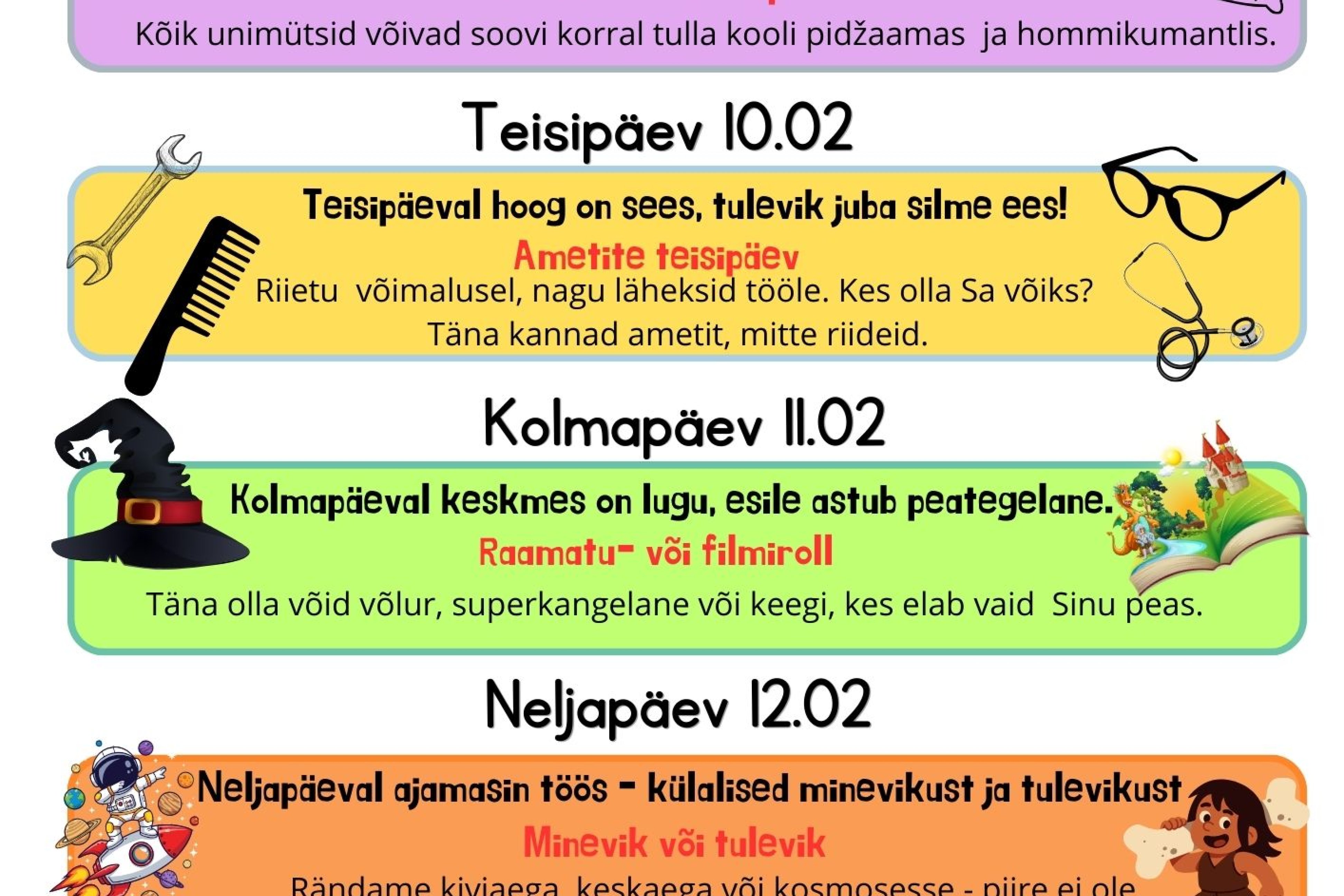Sõbrapäeva nädalal (9.-13. veebruar) toimuvad koolis stiilipäevad! Täpsem info plakatil ja Stuudiumis.